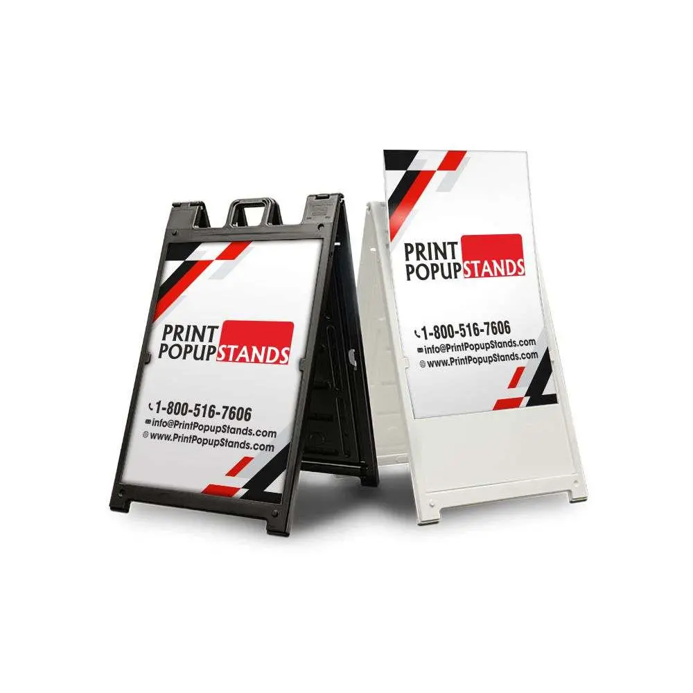 A Frame Signs attracts attention with Print Popup Stands’ A-Frame Signs, a classic and recognizable form of outdoor signage. Ideal for sandwich restaurants, delis, salons, clothing shops, and more, these signs increase foot traffic and promote your business. Additionally, they can be used indoors in malls to direct shoppers to your store. Our Custom A-Frame Signs feature durable plastic material for a lifespan of 5-plus years with proper care. The signboard can be easily inserted into the frame, allowing for effortless purpose changes without replacing the entire sign. Trust Print Popup Stands for eye-catching A-Frame Signs that make a lasting impression.